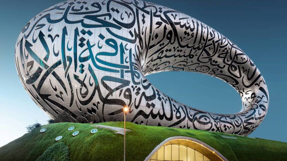 وينفرد المتحف باعتماد واجهته بالكامل على فن الخط واعتماده تحديداً على الخط العربي، الذي يمتاز بجماليات حروفه الاستثنائية التي تجعله الأكثر انسيابية وثراء وتطويعاً بين لغات العالم أجمع في تصميم لوحات فنية مبتكرة، كما تبرز دلالات المقولات التي ترسم خط المستقبل لدبي والإنسانية، لتجسد حقيقة روح المتحف ودوره في استلهام دعوة سموه للعرب إلى «استئناف الحضارة» والعودة إلى الأسس العلمية والثقافية التي ازدهرت وقامت عليها الحضارة العربية.