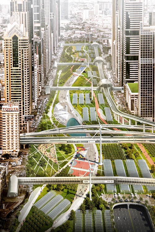 قام Machou Architects بتصميم أطول حديقة زراعية في العالم في دبي. تم تصميم المشروع لتحويل أهم الطرق السريعة في المدينة إلى وادي بيئي ، وقد تم تطوير المشروع استجابةً لنقص المساحات العامة الوظيفية والمساحات الخارجية المستدامة. إعادة تصور طريق الشيخ زايد ، يركز المشروع على شريان النقل الرئيسي في دبي وارتباطه الرئيسي بالمدن الأخرى.