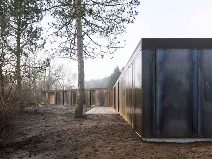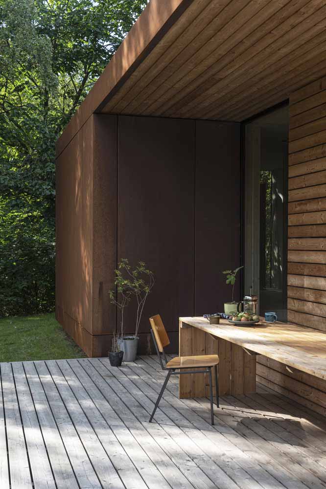 تم بناء المنزل بالكامل من الأخشاب المتداخلة (CLT) ومكسو بألواح من الفولاذ المقاوم للعوامل الجوية الخام التي تتفاعل مع ظروف المواقع وتتطور بمرور الوقت ؛ يبدأ باللون الرمادي الزيتي المعدني ، ويتدرج تدريجياً باللون البرتقالي ، ويتلاشى إلى البني المرقش ويستقر في النهاية في خشب ترابي عميق. تم تطوير نظام الكسوة الفولاذية خصيصًا لهذا المنزل وينتج عنه واجهة غير ثابتة تمامًا.