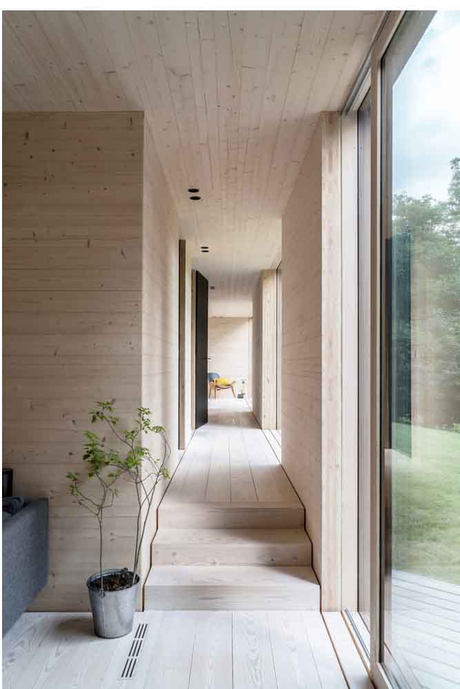 كان المنزل من أوائل المساكن الخاصة التي شيدت في الدنمارك من CLT والتي تم الكشف عنها في جميع أنحاء المنزل ومعالجتها بالطريقة الدنماركية التقليدية بالصابون والغسول الذي يحمي الأخشاب ويعطيها لمسة ناعمة ومرنة.