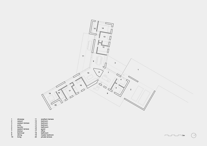 الوصف النصي المقدم من المهندسين المعماريين. تم تصميم فيلا Korup لعائلة صغيرة من ستة أشخاص في جزيرة فين الدنماركية بعد أن دمر حريق منزلهم السابق. تم تطوير الخطة المميزة “ثلاثية الأرجل” من أجل تحديد الجوانب المختلفة للمناظر الطبيعية ، وإبراز صفاتها وخلق ثلاثة مساحات مميزة تشبه الفناء ؛ منطقة منحدرة مشمسة مواجهة للجنوب إلى الجنوب ، وحديقة مطبخ محمية إلى الشرق وملعب بستان من الغرب.